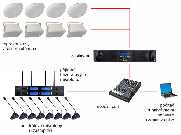 Ozvučení zasedání městského zastupitelstva je koncipováno na bázi mikrofonního bezdrátového systému WA 510RC, které je doplněno reproduktory, mixážním pultem a výkonovým zesilovačem.