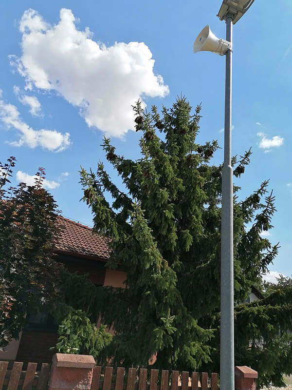 reaguji na Vaši soutěž a zasílám foto zakoupeného SC 35AH reentrantního reproduktoru (celk.5ks), které jsem nainstaloval na sloupy VO u nás v obci. Tlampače hrají skvěle a splňují účel.