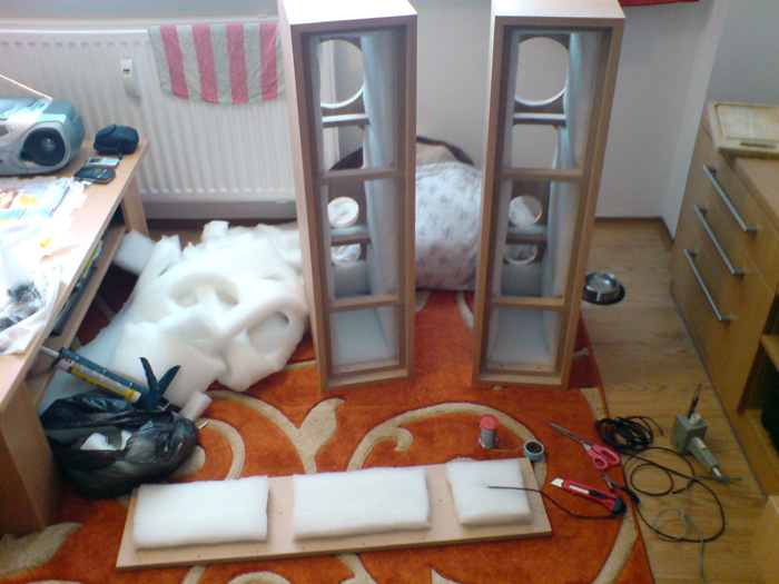 Pro úplnou představu jsem nafotil v průběhu stavby pár fotek. Myslím,že po vzhledové stránce jsou pěkné a všem mým známým se velice líbily. Po zvukové stránce si je netroufám hodnotit a ani nevím pořádně jak je popsat, ale ve mě i všech přizvaných zanechaly hluboký dojem. Hrají čistě, vyrovnaně a s naprostou jistotou i ve vyšších hlasitostech. Náklady na stavbu těchto sloupovek se mi vyšplhaly na 12 000kč, což si myslím, že je slušná cena. A pocit, že vám doma hrají vámi postavené reprobedny, je k nezaplacení!