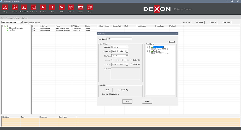 - Mozkem systému je Dexon IP Audio Server – propracovaná řídící administrátorská stále běžící aplikace.